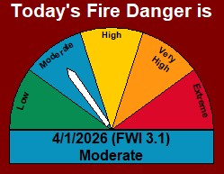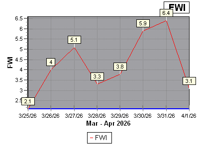 The Chandler Burning Index (CBI) uses the air temperature and relative humidity to calculate a numerical index of fire danger. That number is then equated to the Fire Danger severity of either extreme, very high, high, moderate, or low. It's based solely on weather conditions, with no adjustment for fuel moisture. |