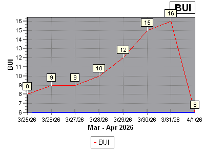 The Build Up Index (BUI) shows the amount of fuel available for combustion, indicating how the fire will develop after initial spread. It is calculated from the Duff Moisture Code and the Drought Code. The BUI scale starts at zero and is open-ended. A rating above 34 is high, above 77 is extreme. |