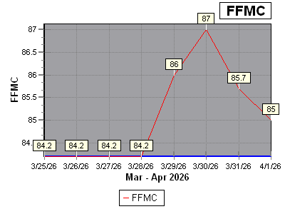 The Fine Fuel Moisture Code (FFMC) is a numerical rating of the moisture content of surface litter and other cured fine fuels. It shows the relative ease of ignition and flammability of fine fuels. The moisture content of fine fuels is very sensitive to the weather. Even a day of rain, or of fine and windy weather, will significantly affect the FFMC rating. The system uses a time lag of two-thirds of a day to accurately measure the moisture content in fine fuels. The FFMC rating is on a scale of 0 to 99. Any figure above 70 is high, and above 90 is extreme. |