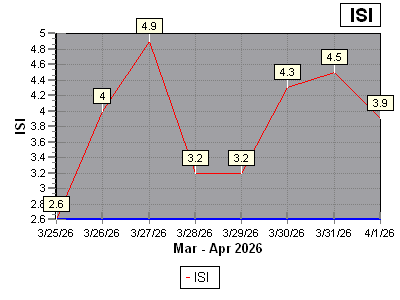 | 3/29/2026 | 57.8 | 47 | 3.7 | 0.00 | 86.0 | 7 | 112 | 3.2 | 12 | 3.8 | MODERATE |