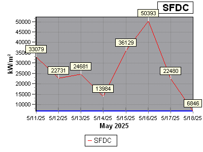 The Scrub Fire Danger Code (SFDC) is based on predicted generated "fire intensity (kw/m²)" in flammable scrub type vegetation (tea tree, broom, gorse, manuka). This code denotes how difficult it would be to control a fire in this vegetation type should one start. |